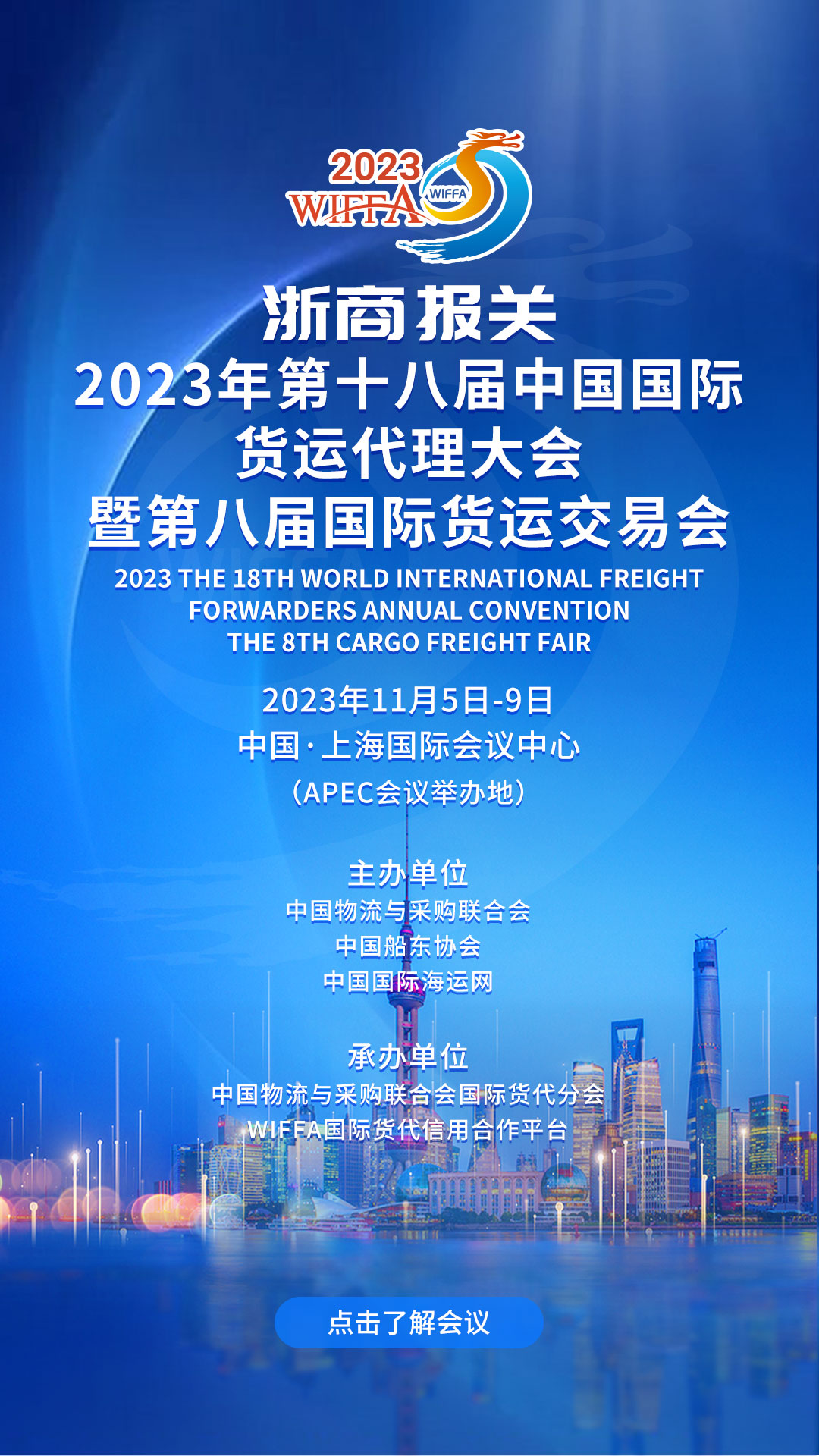 中国国际货运代理大会暨国际货运交易会(简称“WIFFA两会”)是中国航运物流业最具规模和影响力的大会。2023年第十八届“WIFFA两会”将于11月5-9日在上海国际会议中心与“中国进口博览会”同期举办:对接进博,服务全球。